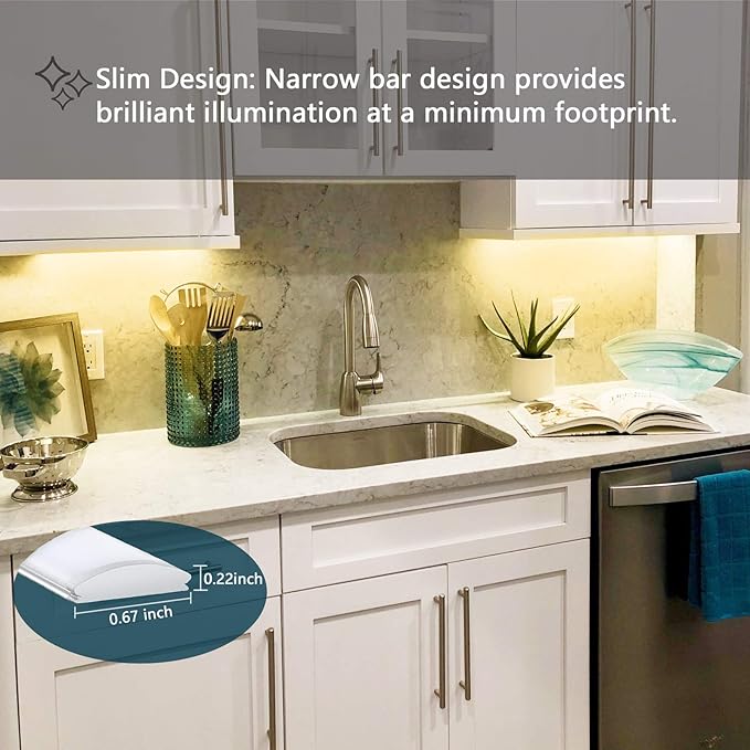 - 💡"Invisible" Kitchen Cabinet Light -- Narrow light bar design provides brilliant illumination at a minimum footprint. The under cabinet lighting is so thin that you cannot see them under the cabinet after it is mounted.