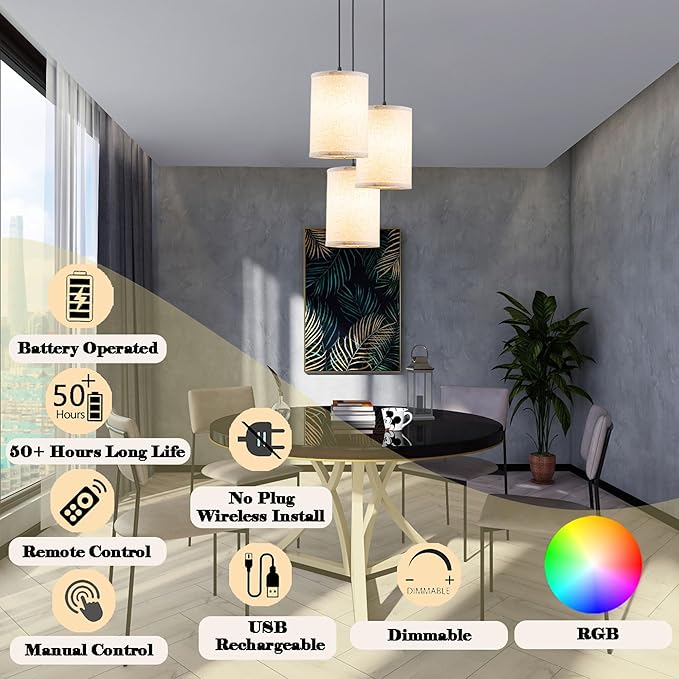 - Dimmable Hanging Light Fixtures- The 500 lumens battery operated led chandelier has 3 color temperature,5 levels brightness and RGB color changing. You can adjust the lights to lift moods, shift ambiance, increase the warmth of your home and even improve your productivity.New lighting points can be added at anywhere according to your needs, no need to worry about ruining your original home improvement.