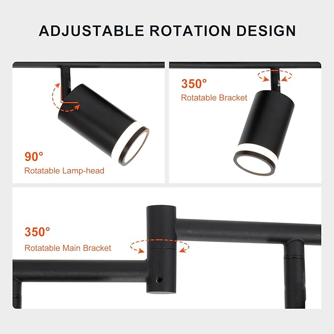 - 【PIVOTING TRACK HEADS】Each lamp head of the ceiling spotlight can be adjusted independently at 350 degrees horizontally and 90 degrees vertically, and with the adjustable lamp arm, you can freely point the light to the place you need to illuminateen, the power of each GU10 bulb does not exceed 40W