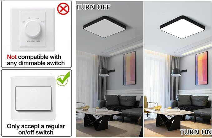- Slim Squae Modern Ceiling Light: The 19.6 inch black ceiling lamp is only 2 inches thick, which is made of high-quality fire-resistant plastic lampshade and iron frame. Good backlight effect thanks to edge light. The simple design and slim shape, so this led light fixture matches all room decorations and is also suitable for low ceilings. (HARD WIRED, NOT BATTERY OPERATED).