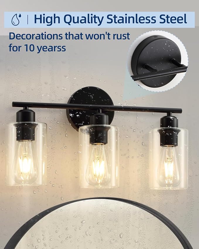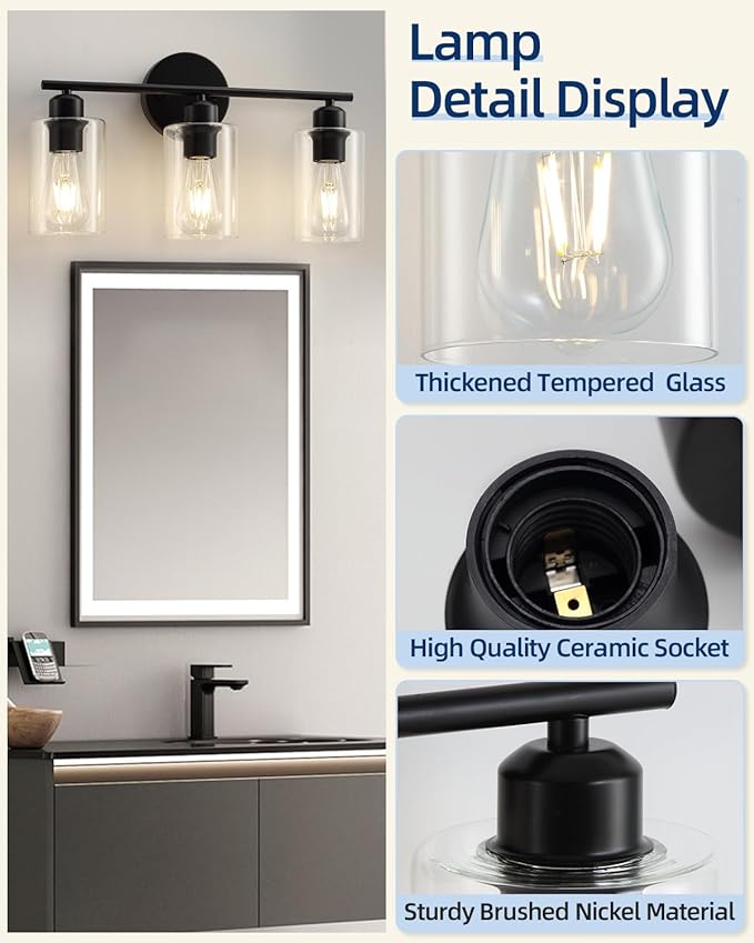 3-Light Matte Black Vanity Lights, Modern Bathroom Light Fixtures Over Mirror With Clear Glass Shade, Wall Sconce Lighting for Hallway - 2Pack