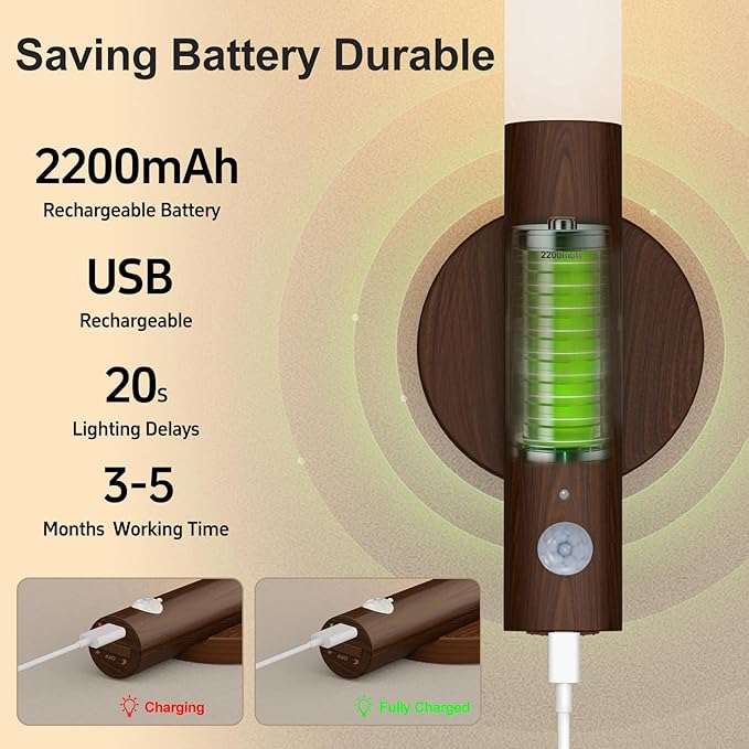 - 2200mAh Rechargeable Motion Sensor Light: Our battery-powered wall sconces features a built-in 2200mAh rechargeable battery, ideal for places without wiring or sockets, eliminating concerns about battery replacement. When fully charged, the battery operated motion sensor night light can last approximately 5 months in night mode (depending on your frequency of use)