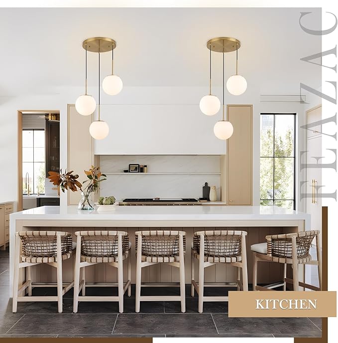 - 【Modern Craftsmanship & Design】This cluster pendant light features a gold frame and three 8″ milky white glass shades. The glass shades spread light evenly, giving off a soft, glare-free glow. Ideal for kitchen island, bedroom, dining room, living room, cafe, or foyer