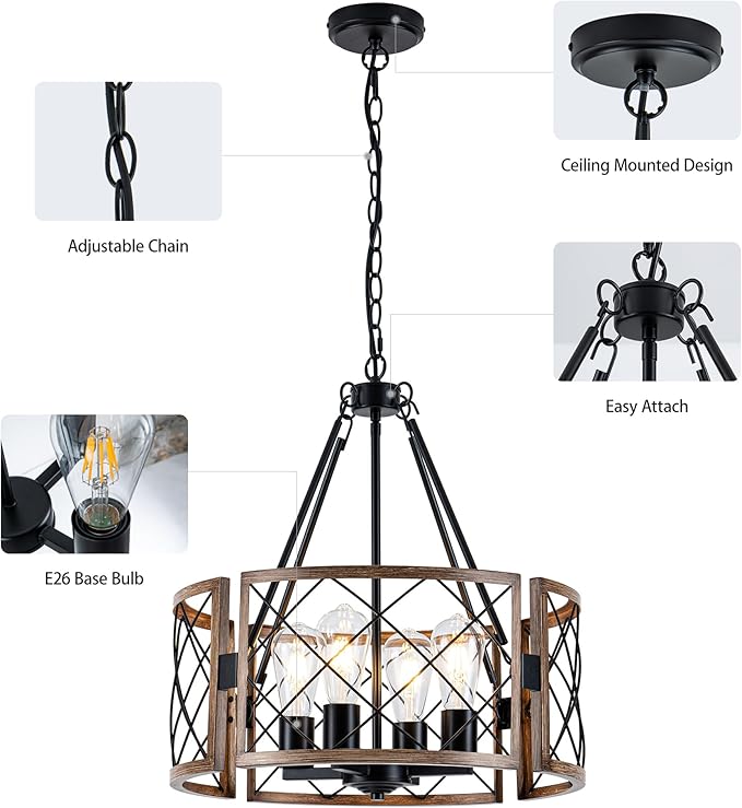 - 【Bulb Requires】Personalize your light! This fixture requires 4 E26 bulbs (not included, 60W max each), giving you the freedom to choose LED, CFL, or Halogen types. For ultimate control, pair with a dimmer switch and dimmable bulbs to create the ideal mood for any occasion.
