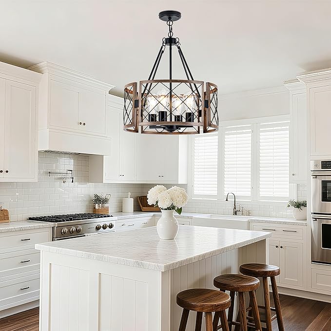 - 【Modern Farmhouse Design】Crafted with a gray oak drum shade and a black metal grid, this farmhouse chandelier presents a perfect blend of rustic charm and contemporary flair, creating a comfortable yet stylish focal point. It's the perfect choice to illuminate your dining table or kitchen island, making gatherings with family and friends feel even warmer and more inviting.