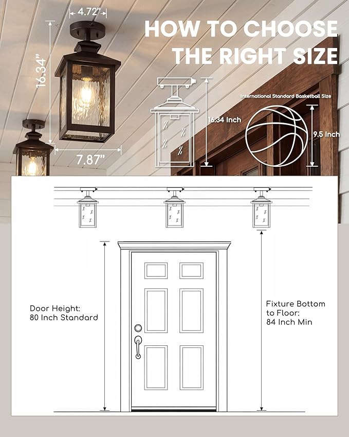 - Compatible E26 Base (Bulb Not Included): The outdoor ceiling porch light support E26 base bulbs up to 60W, compatible with Edison, LED, CFL, incandescent bulbs and etc. Easily choose the brightness and bulb style that best fits your space.